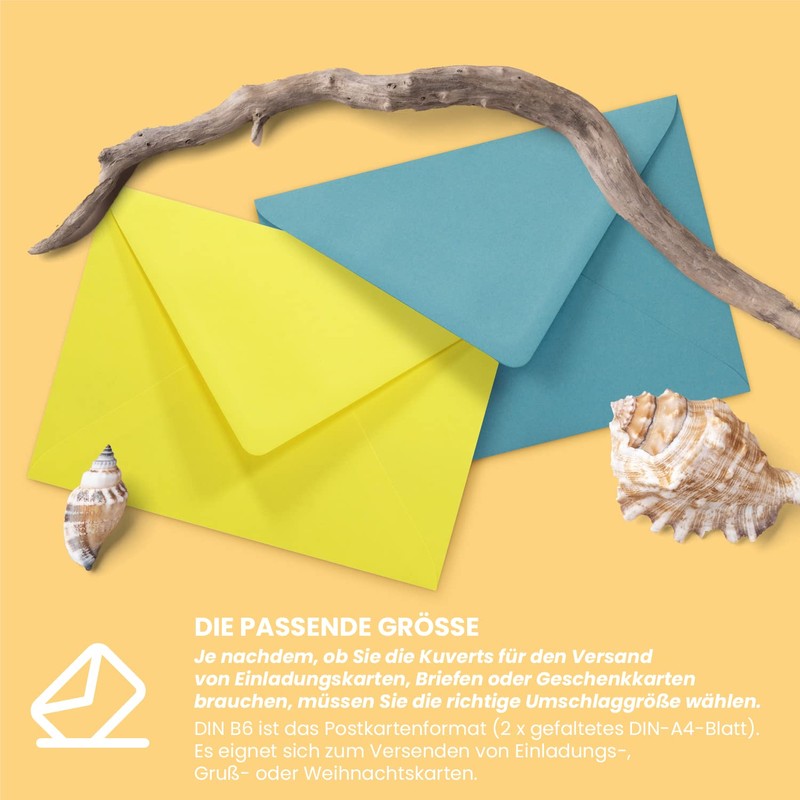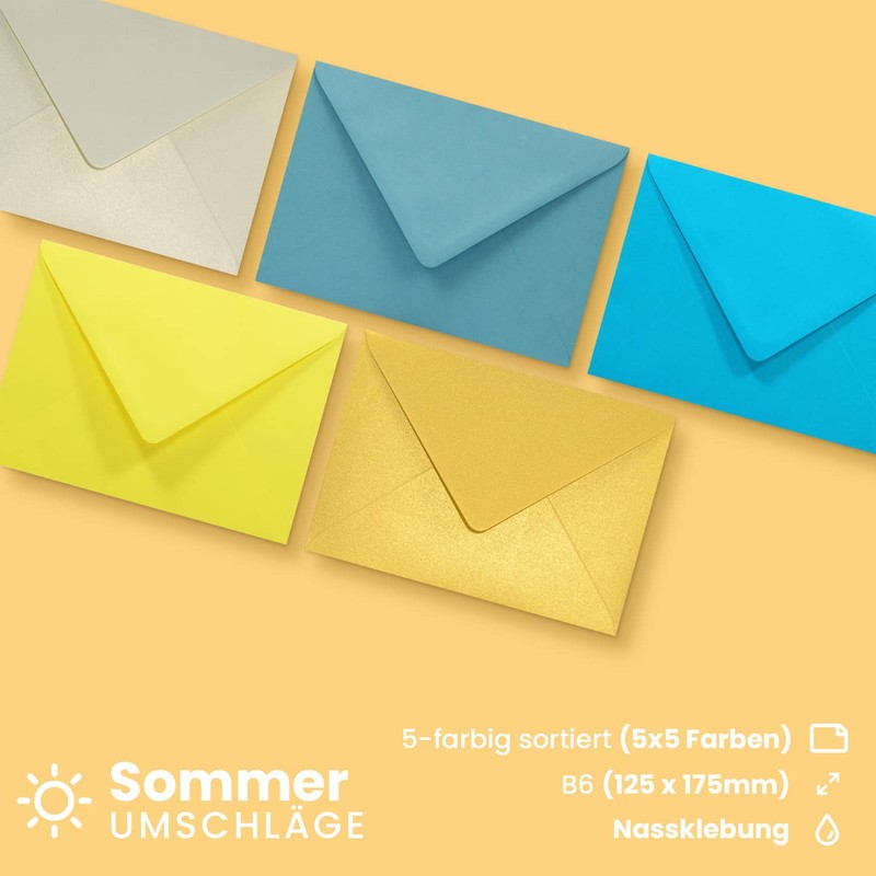 - Box contents: 25 envelopes in DIN B6 format (125 x 175 mm), 5 assorted colours (5 x 5 different colours), FSC-certified, printable and writable, pointed flap, wet adhesive; motif: summer. The colours of the offered product may differ from the colour representation of your monitor.