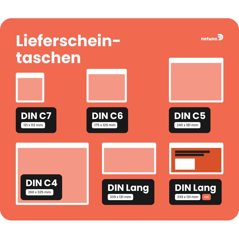 - THE RIGHT SIZE - In our catalogue you will find high-quality delivery note envelopes in various formats. How large a document pouch should be always depends on which accompanying documents you want to send - a delivery note, an invoice or perhaps a small brochure. C5 document envelopes (239x178 mm) are suitable for envelopes or letters in C5 format (A5 sheet, A4 sheet folded in half).