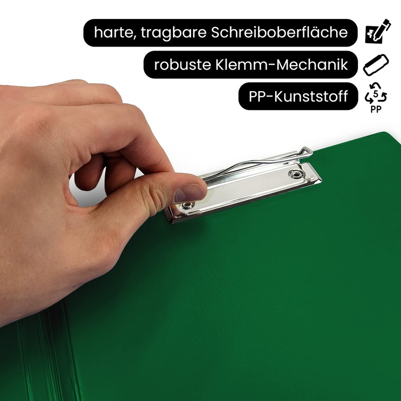 - Practical writing pad - The clipboard provides a hard, portable writing surface. It makes writing by hand easier when a fixed workspace is missing, e.g. during customer meetings or project days.