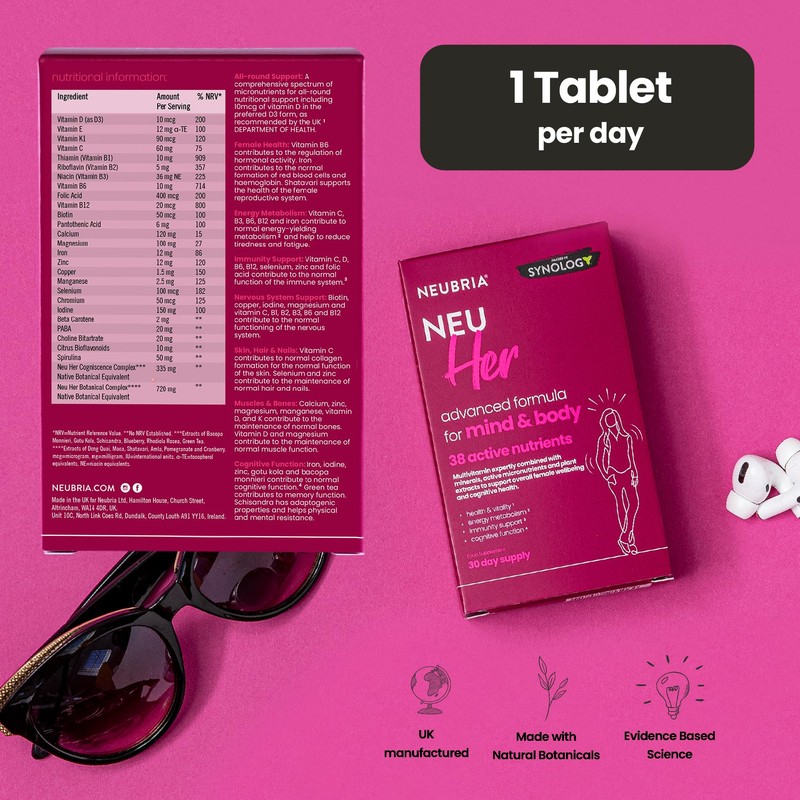 - ADVANCED ALL-IN-ONE FEMALE MULTIVITAMIN: Specially formulated for women, NEUBRIA NEU HER contains 38 essential nutrients including vitamins D3, B12, C, E, and K, along with iron, zinc, and iodine to support cognitive function and overall health.