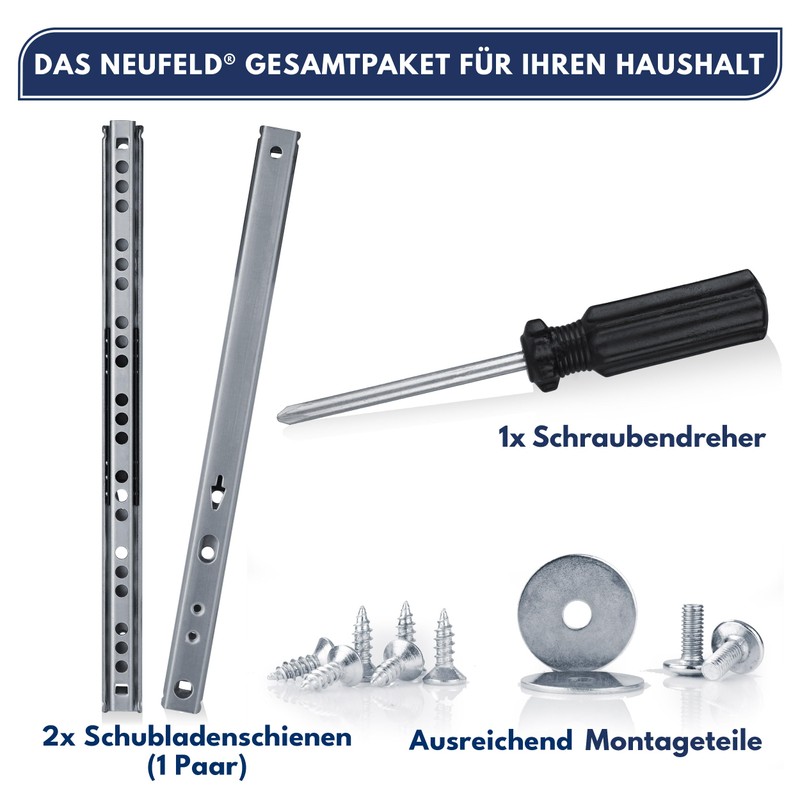 - ✔ Perfect fit standard model – the NEUFELD drawer runners fit almost any household drawer. The slide rail can withstand maximum loads without bending