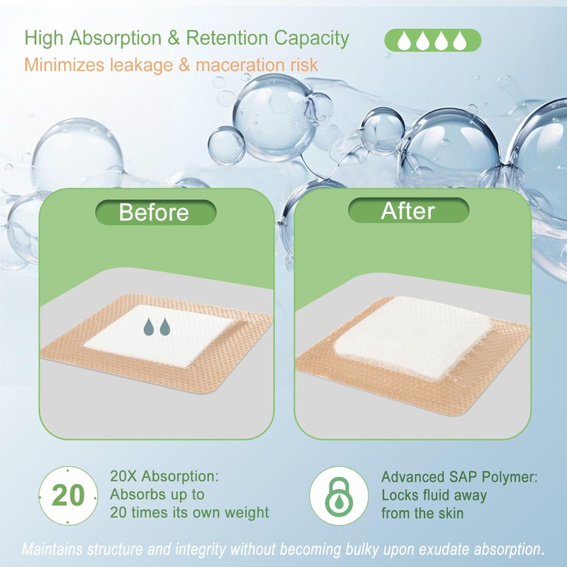 - ✅Superabsorbent Core Layer – Advanced polymer particles absorb and retain high levels of exudate, preventing leakage and maceration. Maintains structural integrity without bulking, even under heavy fluid loads.