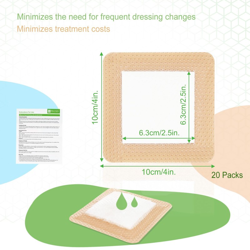 - ✅Gentle Silicone Adhesive Technology – Securely adheres to skin without extra tape or bandages, minimizing trauma & pain during dressing changes. Repositionable for sensitive or fragile skin. Dressing size 4 in. x 4 in., absorbent pad size 2.5in. x 2.5in., indivial package, 20 packs.