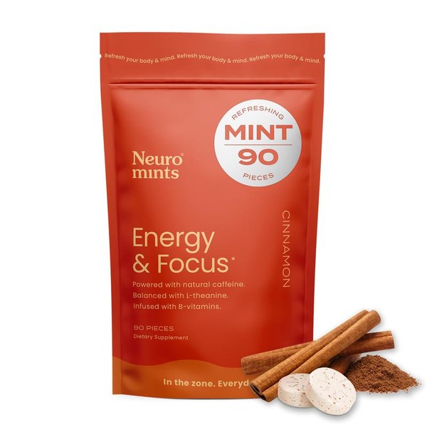 Neuro Energy Caffeine Mints (90 Pieces) - Sugar-Free Nootropic Mints for Energy & Focus with L-theanine, Caffeine, Vitamin B12 & Vitamin B6 - Cinnamon Flavor