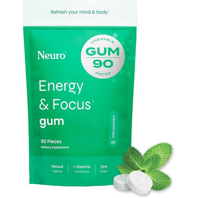 NeuroGum Energy & Focus Gum (90 Count Bag, Spearmint) | 40mg Natural Caffeine + L-Theanine + Vitamin B12 & B6 + Xylitol | Sugar Free Nootropic Cognitive Brain Performance Supplement
