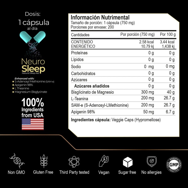 NeuroSleep combina de manera estratégica SAM-e, apigenina al 98% extraída de la manzanilla, Bisglicinato de magnesio y L-Teanina para ofrecer un enfoque natural en la mejora del descanso nocturno y el bienestar cognitivo.