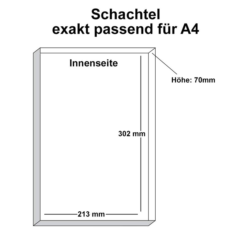 - Maße innen: 302 x 213 x 70 mm bzw. Länge 30,2 cm x Breite 21,3 cm x Höhe 7 cm exakt passend für DIN A4 Dokumente - Maße aussen: 304 x 215 x 72 mm bzw. Länge 30,4 cm x Breite 21,5 cm x Höhe 7,2 cm