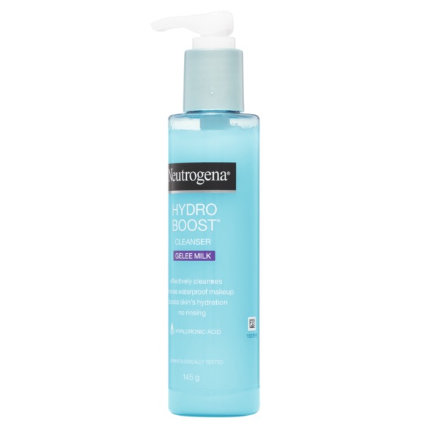 Neutrogena Hydro Boost Gelee Milk Cleanser with Hyaluronic Acid effectively cleanses, removes waterproof makeup and boosts skin's hydration with no rinsing.