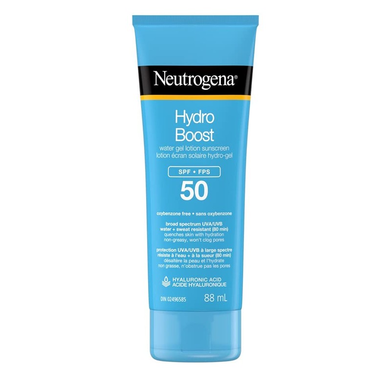 - Neutrogena Hydro Boost Water Gel lotion sunscreen SPF 50 provides Helioplex broad spectrum UVA/UVB sun protection for Face & Body