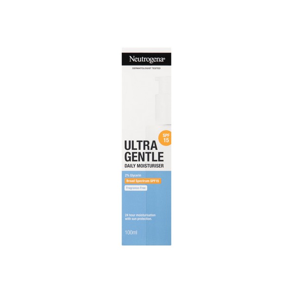 Neutrogena Ultra Gentle Daily Moisturiser SPF15 is a lightweight, oil-free formula that absorbs quickly to keep skin moisturised for 24 hours. Made with Glycerin, well known to improve skin hydration, and help strengthen skin's moisture barrier, and UVA/UVB broad spectrum sun protection to help prevent premature skin ageing.
