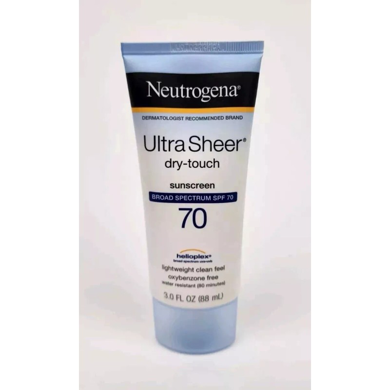 - 3-fluid ounce travel size bottle of Neutrogena Ultra Sheer Dry-Touch Non-Greasy Sunscreen with SPF 70 for broad spectrum UVA/UVB protection