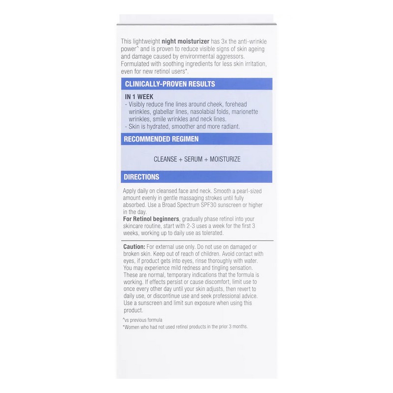 Ideal for a beginner retinol user, Neutrogena Visible Repair Retinol Night Moisturizer has 3x the anti-wrinkle power^ and is proven to reduce visible signs of skin ageing and damage caused by environmental aggressors, and is formulated with soothing ingredients for less skin irritation, even for new retinol users*.