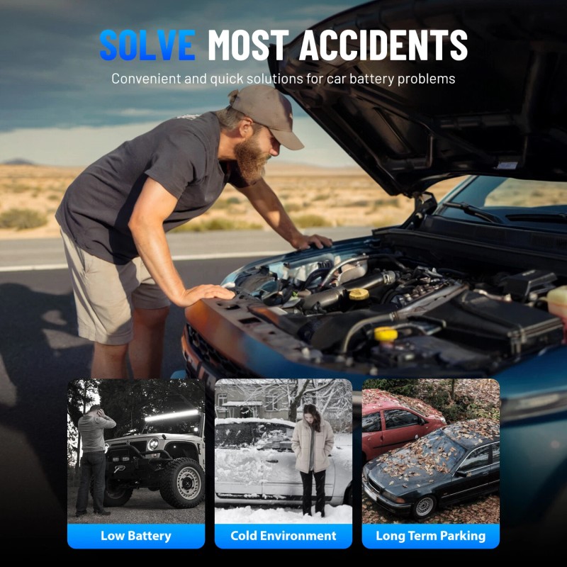【Multiple Protections Chip】With 10 built-in safety protection technologies (over-charge, over-current, short-circuit, reverse-polarity, low-temp, high-temp, over-voltage, over-load, spark-proof, reverse-charge). Auto detect connection, real-time visible alarms, the car battery charger jump starter portable is 100% safe, no sparks.