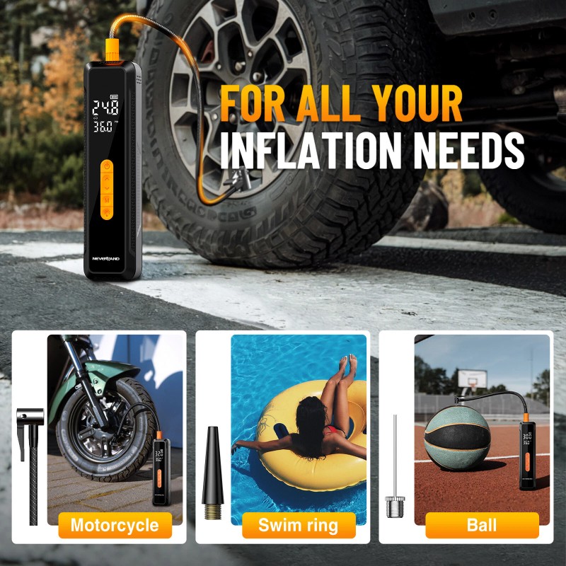 A4: NEVERLAND tire inflator portable air compressor comes with different nozzles. When inflating different objects, you can choose the corresponding nozzle and mode for inflation.