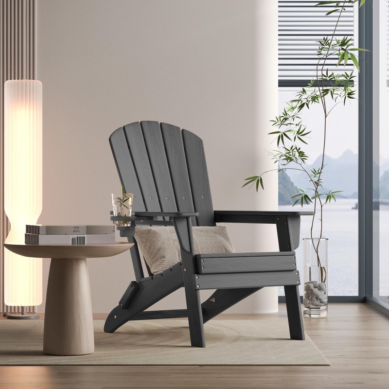 Foldable Adirondack chair with cup holder, perfect for garden seating, fire pits, and patio decks