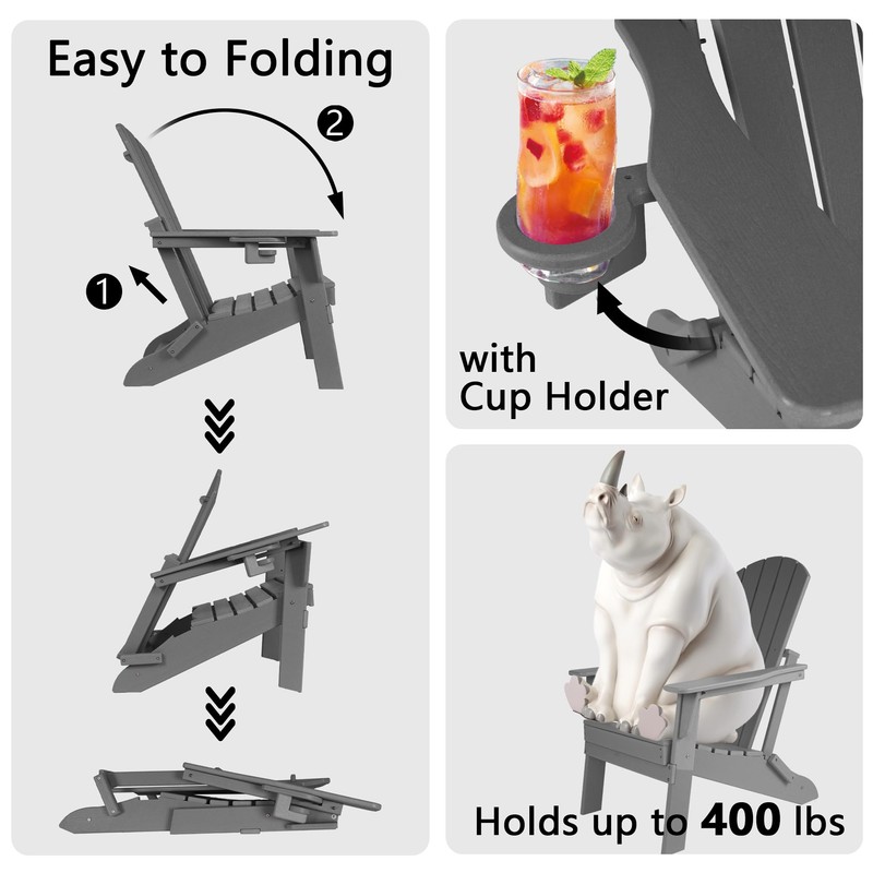 nevilywood Folding Adirondack Chair - Extended Ergonomic Backrest, Cup Holder - Easy Assembly - Durable HDPE Plastic, Weather Resistant & Maintenance-Free - Lawn, Patio, Deck Supports 400lbs Grey