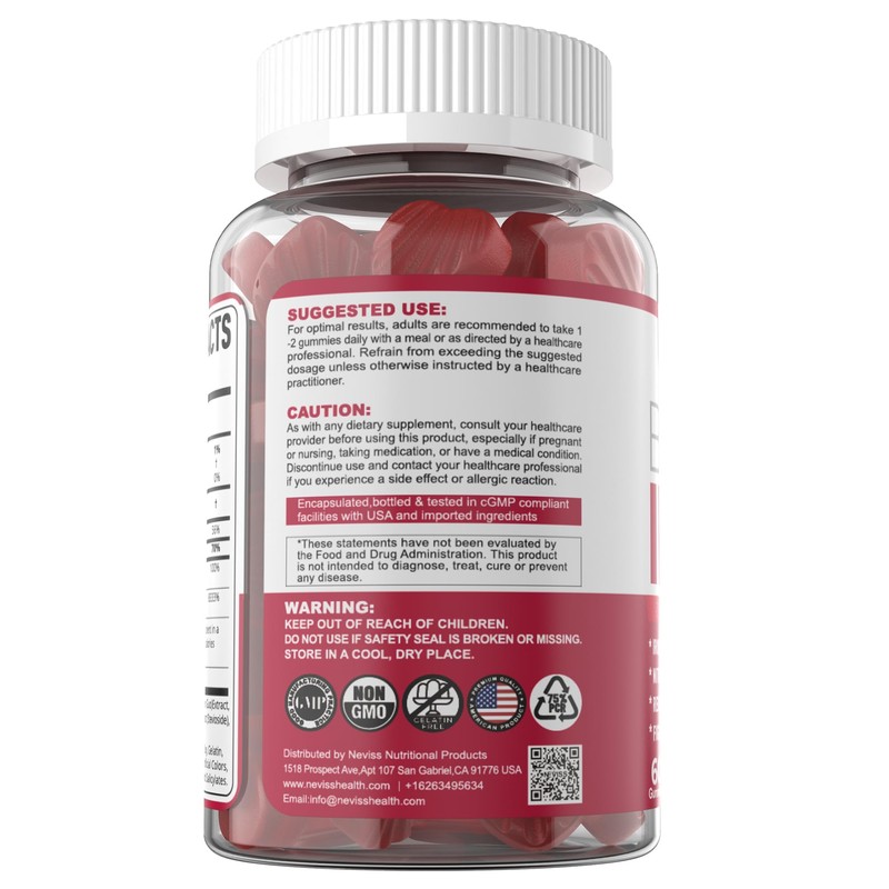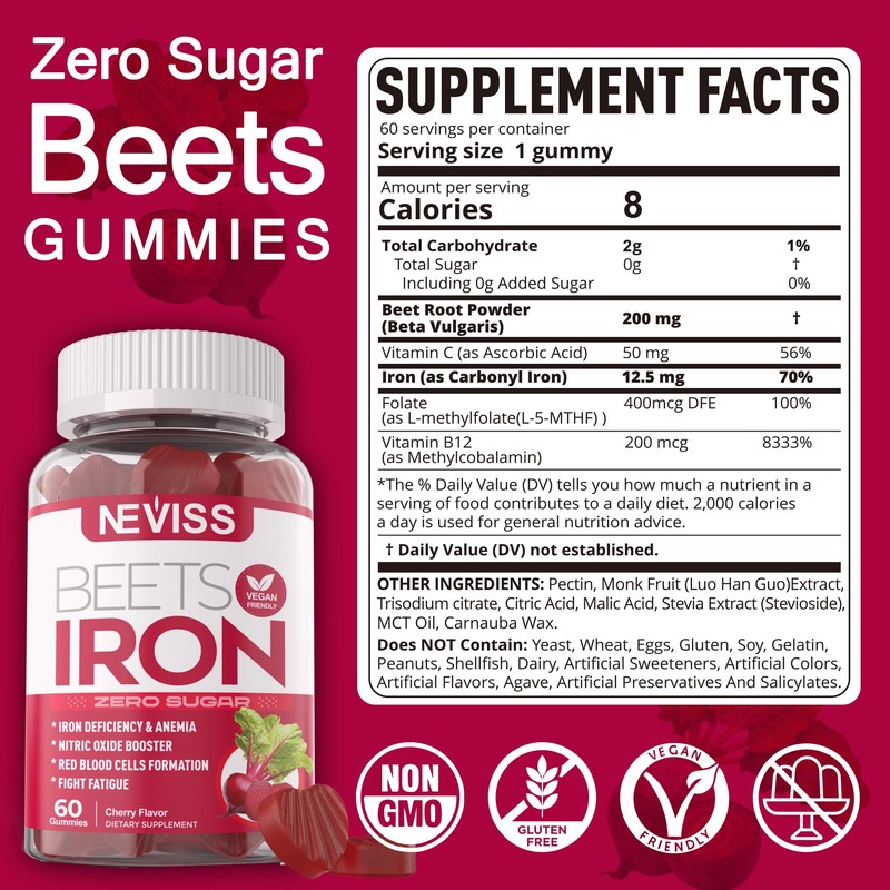 - Increase Iron LevelsIron is essential for the production of hemoglobin, a protein in red blood cells that transports oxygen to the body's tissues and organs, which helps blood flow and energy production. Neviss iron supplement, in carbonyl iron form, boasts over 98% iron content, ensuring easy absorption and utilization by the body. Just one gummy daily can effectively boost and maintain your iron levels for optimal health!