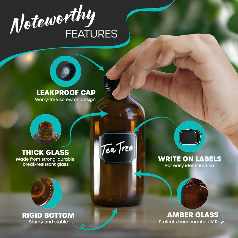 - The amber glass bottles with lid are leak proof and made from strong and stylish amber glass and comes with durable plastic covers, the beautiful amber coloring not only looks good but will also protect your contents from any harmful UV rays.