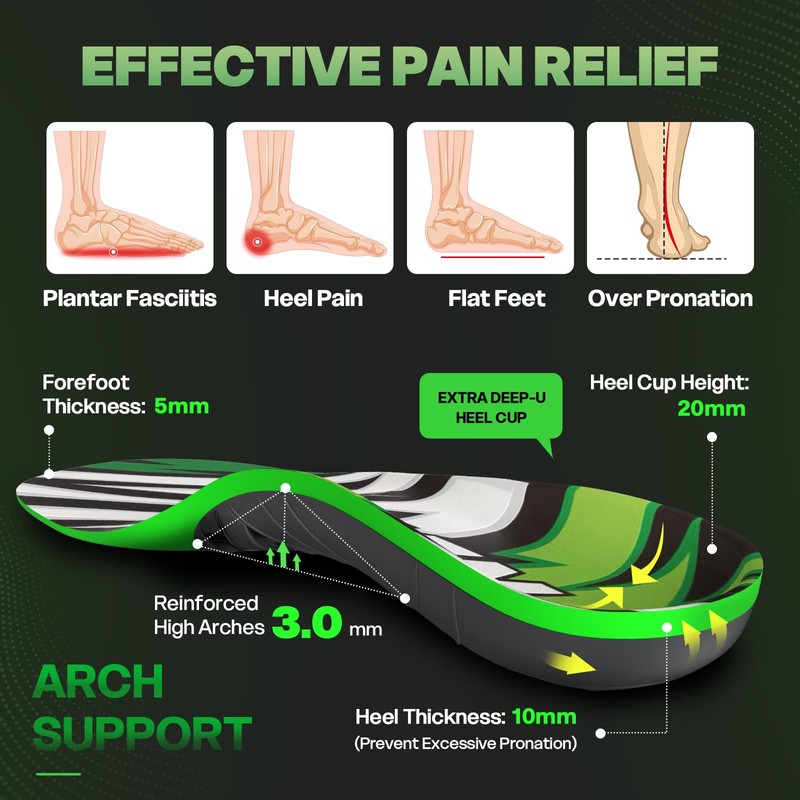 - Orthopedic-Grade Arch Support: a TPU bridge redistributes 66 % of plantar pressure—compared with only 40 % for plastic arches—relieving pain from plantar fasciitis and flat feet. That’s why these orthotic insoles come podiatrist-recommended for overpronation