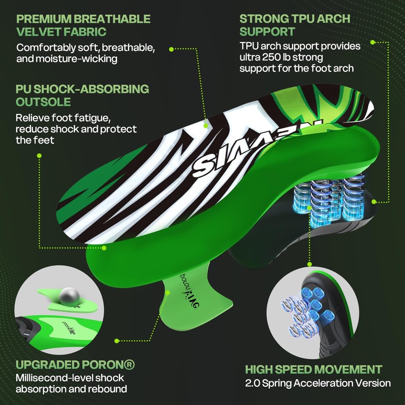 - Triple-Layer Impact Defense: a PU base cushions your arch for plantar fasciitis relief, Premium PORON material in the forefoot pad shields the balls of your feet, and a rigid TPU heel cup locks the springs in place—lasting twice as long as foam or gel insoles