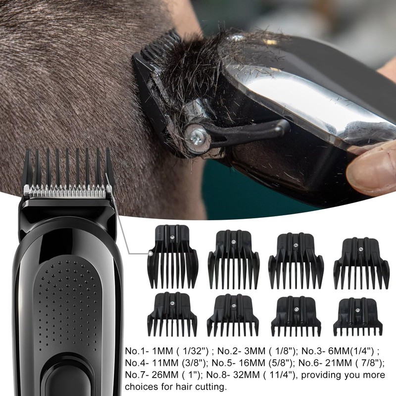 - 【Size】 No.1- 1MM ( 1/32") ; No.2- 3MM ( 1/8"); No.3- 6MM(1/4") ; No.4- 11MM (3/8"); No.5- 16MM (5/8"); No.6- 21MM ( 7/8"); No.7- 26MM ( 1"); No.8- 32MM ( 11/4"), providing you more choices for hair cutting.