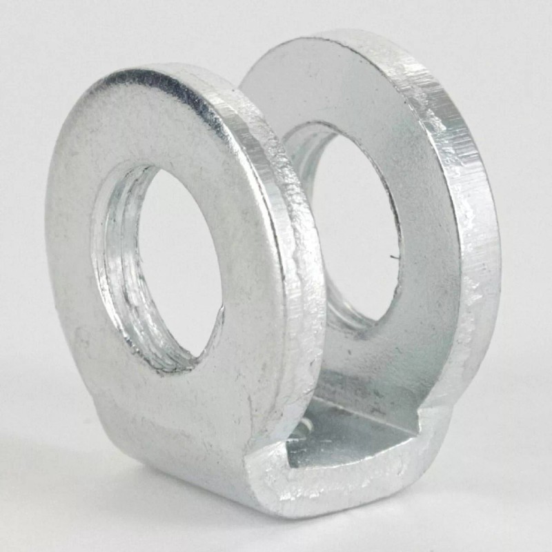 9/16" high stamped threaded steel hickeys that are used to connect steel lamp pipe. These have 3/8" threaded holes on each end.