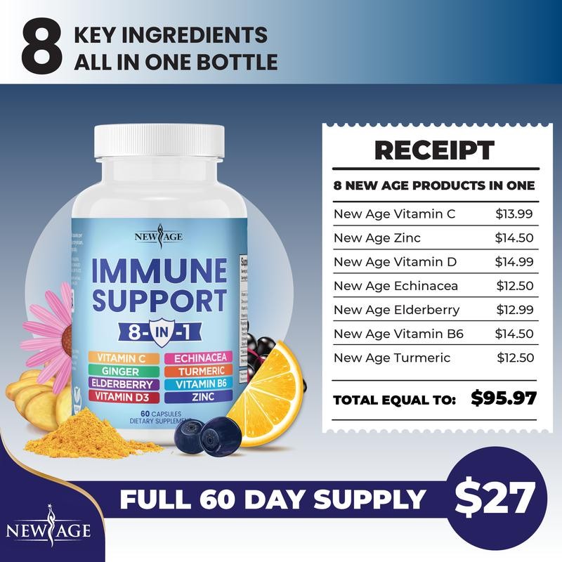NEW AGE 8 in 1 Immune Support Booster Supplement with Echinacea, Vitamin C and Zinc 50mg, Vitamin D 5000 IU, Turmeric Curcumin & Ginger, B6, Elderberry Dietary Healthcare - Size: 1 Bottle