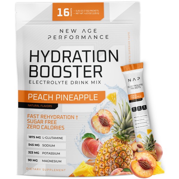 New Age Hydration Packets, Electrolytes Powder, Liquid Enhancer for Dehydration Relief, L-Glutamine Amino Acids for Muscle Workout Recovery, Sugar Free & 0 Calorie, 16 Packets (Peach Pineapple)