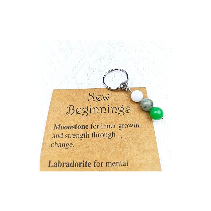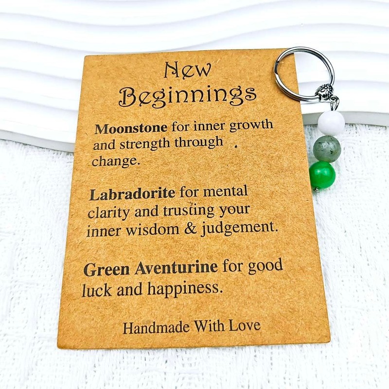 - New Beginnings Gift Keychain for Women: The natural crystal keychain composed of three crystal beads, moonstone for inner growth and strength though change, labradorite for mental clarity and trusting yourinner wisdom & judgment, green aventurine for good luck and happiness
