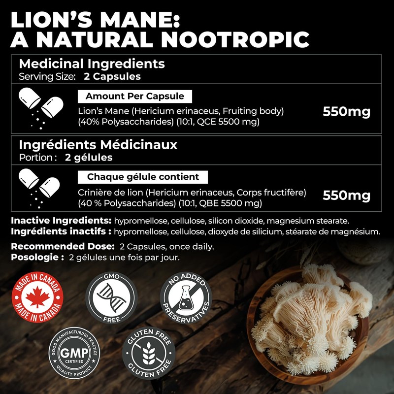- Containing 160 Capsules of 100% Lion’s Mane Mushroom Powder, our product is proudly made & assessed for purity & quality in Canada. It contains no fillers, binders, harmful chemicals & is free from GMOs, gluten & animal products. Canadian Natural Product Number: 80123148. Vegan Friendly.
