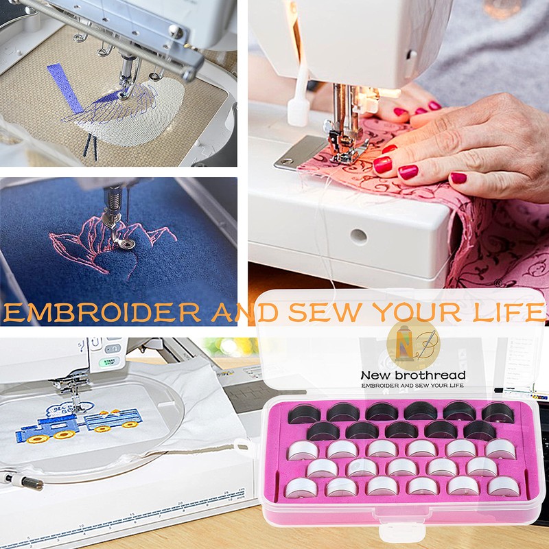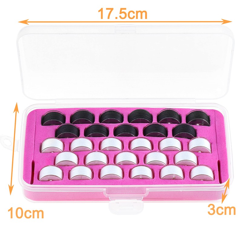 - ➤ Clear Plastic Case+28pcs Prewound Bobbin Threads: The foam pad with holes can hold bobbins snugly and prevent the bobbin threads from unraveling. The superb transparency of the box allows you to see the thread colors clearly. Hanging the storage box on the wall with hook is available.