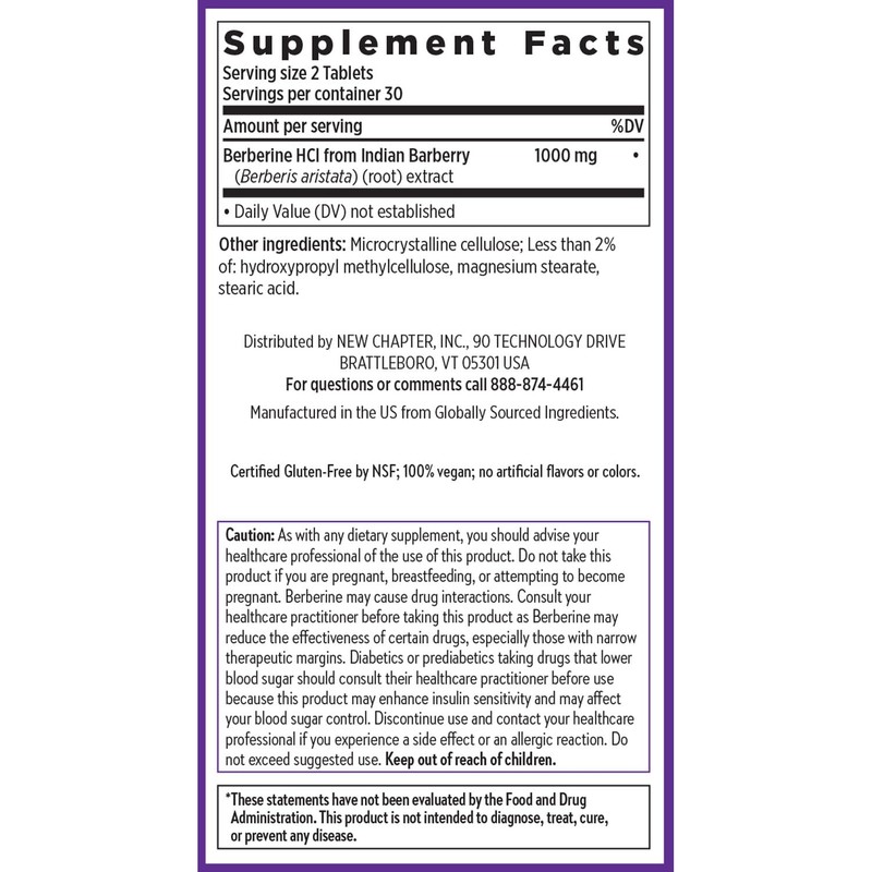 The benefits of Berberine supplements are perfect for 21st century well-being and vitality. Berberine 1000 mg from New Chapter® is masterfully crafted to support your heart health and overall metabolic health (how the body converts food into fuel).* Convenient to take with any meal or snack. Add our excellent-quality 2-tablet formula to your wellness journey and feel the difference that Nature's pure herbs can make! Each serving delivers 1000 mg of 30x concentrated Berberine extract from authentic Indian Barberry root (Berberis aristata). *These statements have not been evaluated by the Food and Drug Administration. This product is not intended to diagnose, treat, cure, or prevent any disease.