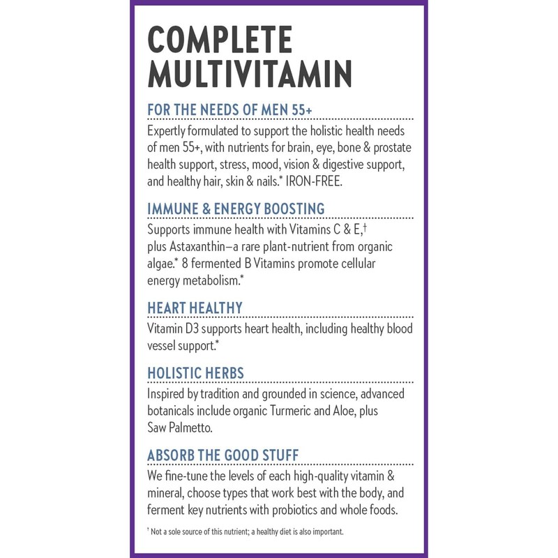 You're getting better with age, and looking forward to years of continued well-being. New Chapter's complete one-daily multivitamin for men 50 plus is expertly designed for you, packed with nutrients for immune, cellular energy, brain, bone & prostate health support, stress, mood, vision & digestive support, and healthy hair, skin & nails.* Enhance overall wellness and healthy aging with essential vitamins and minerals fermented with probiotics, and formulated for your body to recognize and absorb as food. Easily digestible and gentle even on an empty stomach! Here at New Chapter, we sustainably source the highest quality ingredients and craft with you and our planet in mind. That's what we call wellness, well done. IRON-FREE. *These statements have not been evaluated by the Food and Drug Administration. This product is not intended to diagnose, treat, cure or prevent any disease.