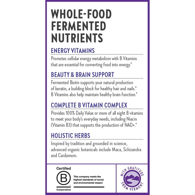 You'll get the most out of this natural energy supplement for women and men because it's masterfully crafted for your body to recognize as food. These are energy & brain vitamins in a form your body can actually use! Replenish B Vitamin levels with Fermented Vitamin B Complex for nerve & brain support, cellular energy metabolism, and beauty support from Biotin for healthy hair & nails.* 100% or more daily value of 8 types of high-quality vitamin B including Methylfolate (MTHFR optimized), plus herbal Energy & Digestion Support Blend with superfood Maca. USDA Organic and Non-GMO Project Verified. * These statements have not been evaluated by the Food and Drug Administration. This product is not intended to diagnose, treat, cure or prevent any disease.