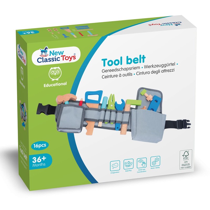New Classic Toys 18286 Adjustable Tool Belt with Colourful Wooden Toy Tools and Accessories, Multi-Coloured
