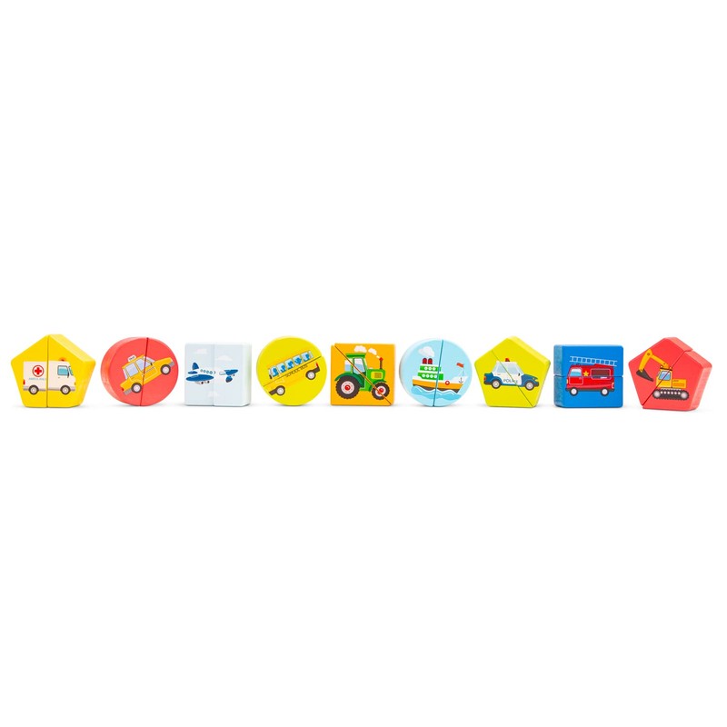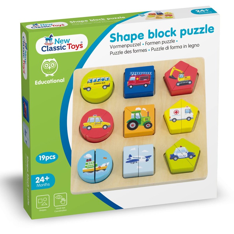 - Explore the world of transportation and vehicles with this wooden block shape puzzle from New Classic Toys.