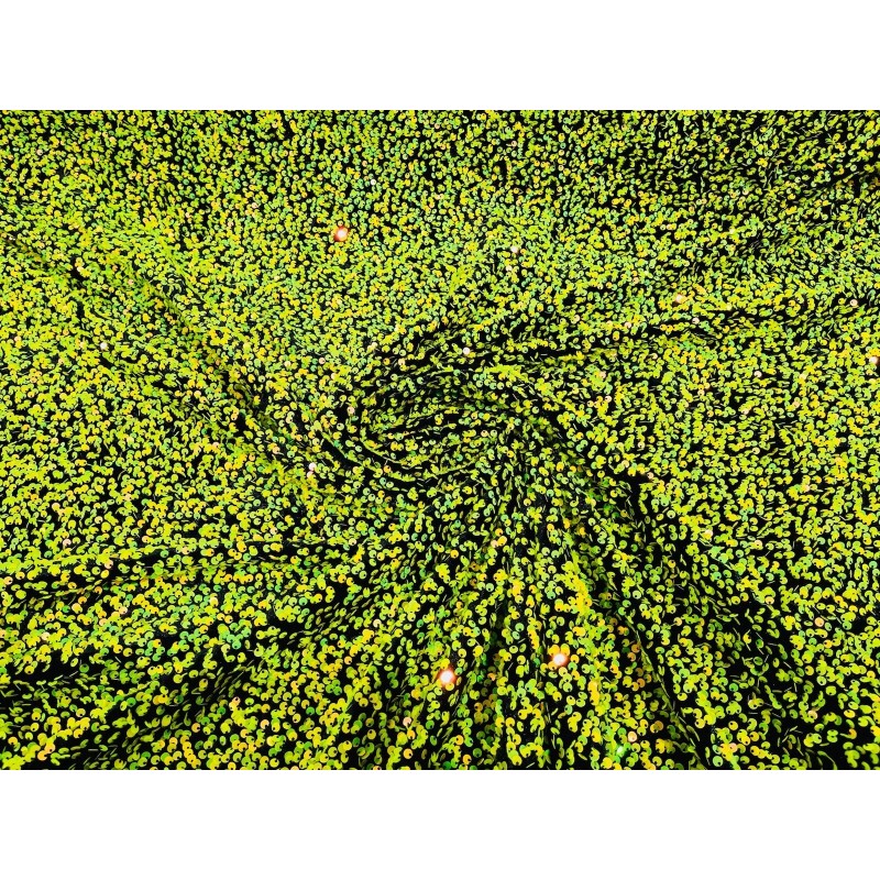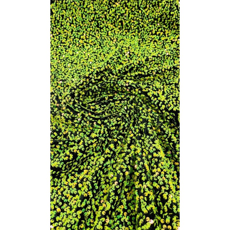 NEW CREATIONS FABRIC AND FOAM INC Lime Green Iridescent 5mm sequins on a Black Stretch velvet 2 way stretch,yard