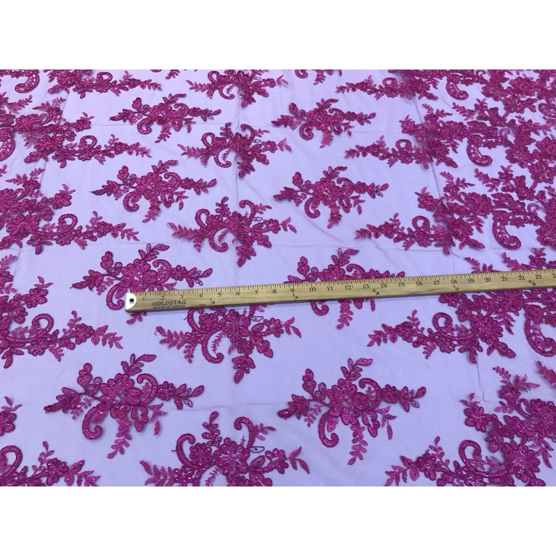 NEW CREATIONS FABRIC AND FOAM INC MAGENTA PINK FLORAL DESIGN EMBROIDER WITH SEQUINS-CORDED LACE-SOLD BY THE YARD.