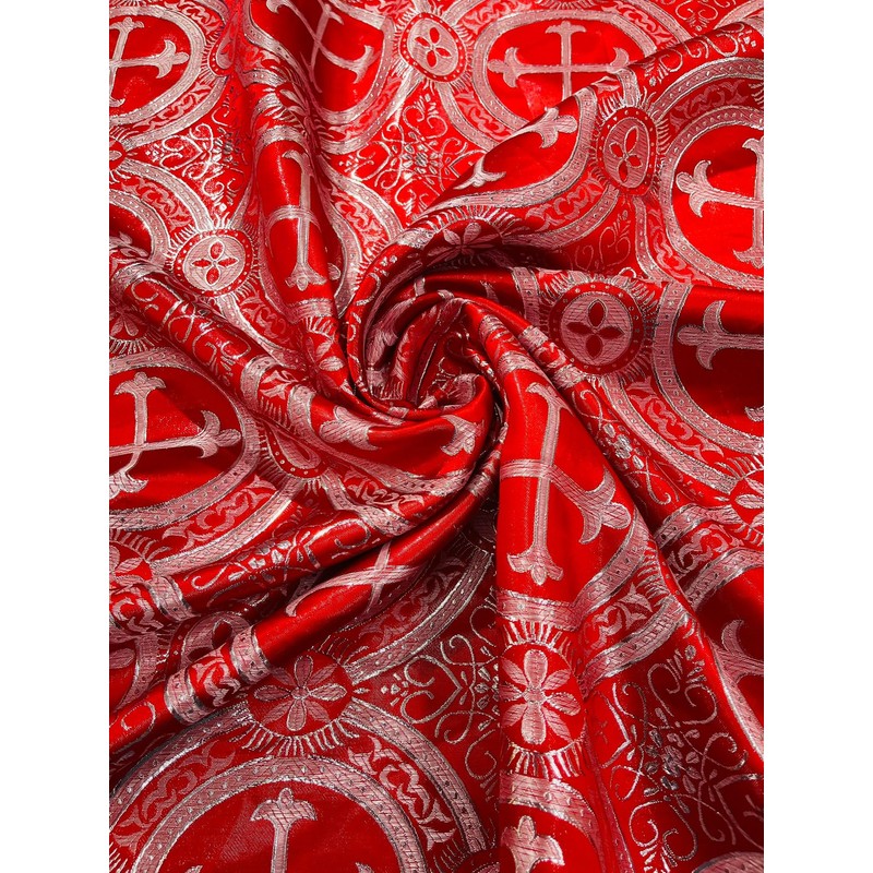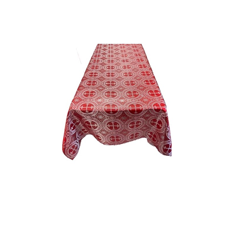 New Creations Fabric & Foam Inc, Rectangular Metallic Cross Brocade Jacquard Satin Tablecloth Overlay/Religious Brocade/Liturgical Fabric/Church. (Red-Silver, 60" x 90" Inches)