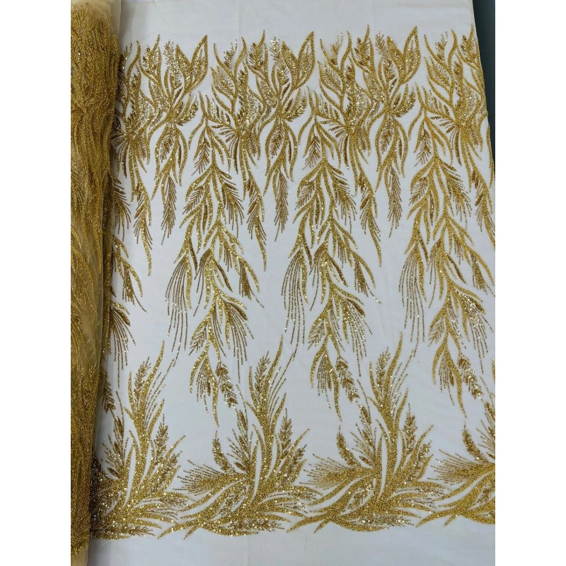 New Creations Fabric & Foam Leaf Design Lace - Gold - Beaded Leaves Pattern Fabric on Lace Sold By Yard