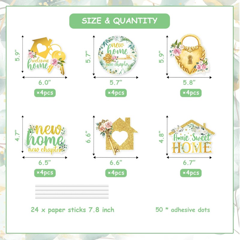 - Unique design: These new home new chapter table centerpieces for housewarming parties feature an elegant aesthetic. The golden accents, such as the glittery houses, locks, keys and hearts, paired with the soft green leaves and floral designs, create a sophisticated yet warm look. The phrases printed on them, like new home new chapter, welcome home, home sweet home, evoking a sense of excitement, making them a stylish addition to any housewarming event