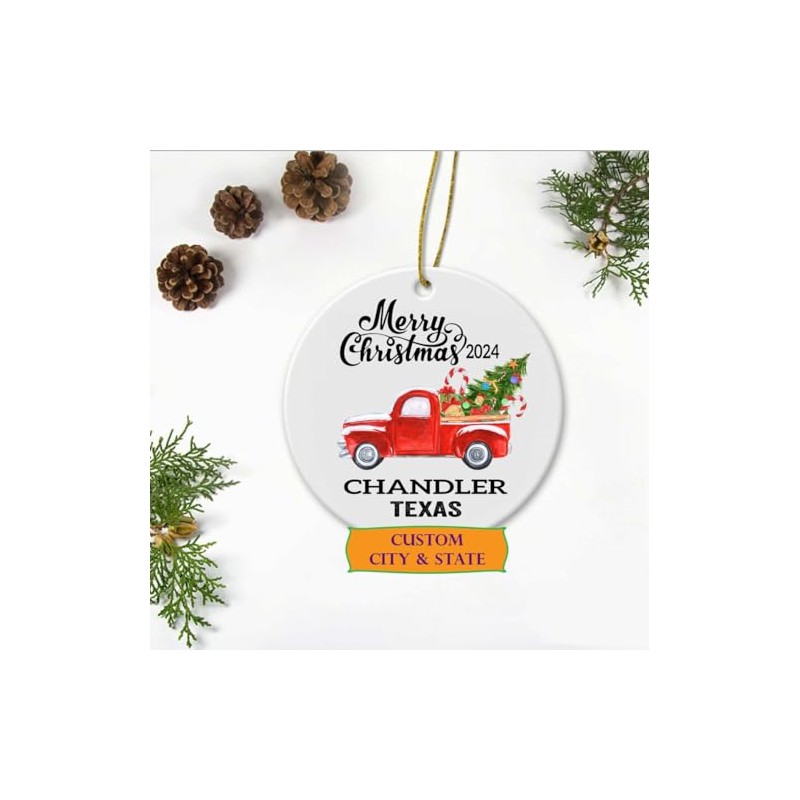 New Home Ornaments 2024 with Custom Name City State Chandler Texas Ornament - Red Truck with Christmas Tree, Keepsake Present for Family Ornament 3" Flat Plastic