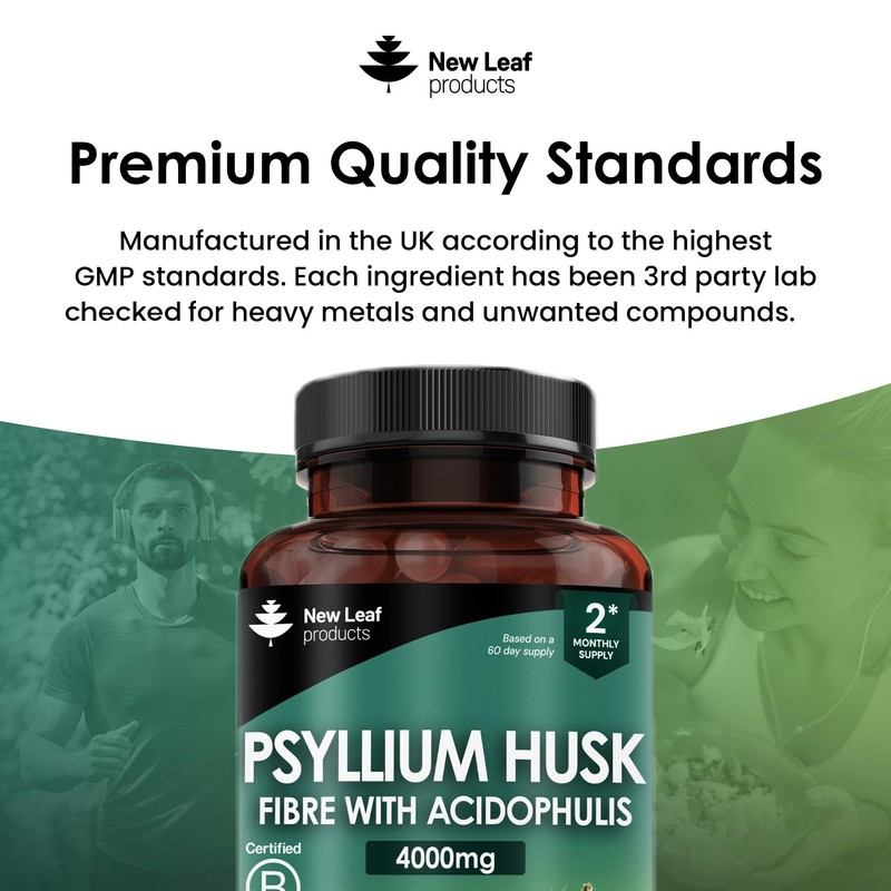 NEW LEAF PRODUCTS Fibre Supplement 4000mg Psyllium Husk with Acidophilus - High Strength - Natural Soluble Fiber Supplement from Plantago Ovata Seeds, 120 Psyllium Husks Capsules Vegan, Made in UK by New Leaf