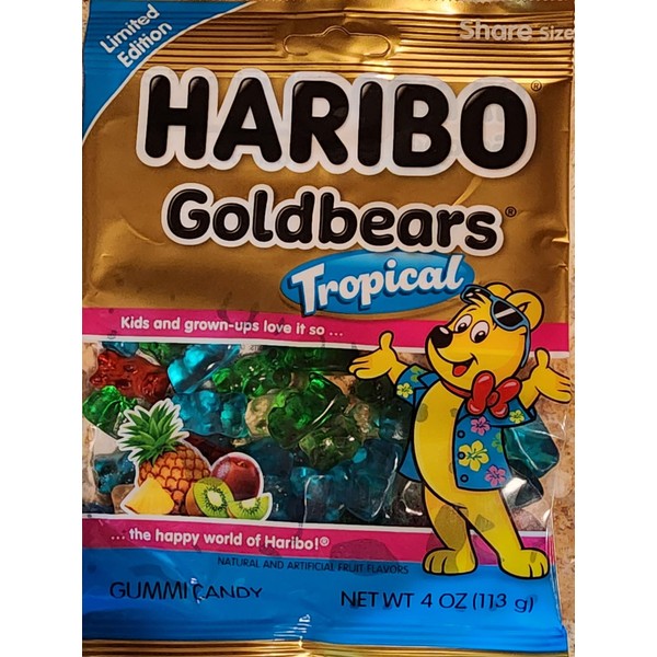 New Limited Edition Haribo Goldbears Gummi Bears Tropical Flavors: Pineapple, Kiwi, Passion Fruit, Paradise Punch. 4oz Share Size