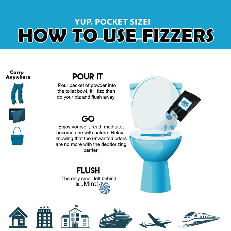 - POOP ODOR ELIMINATION: By dissolving its proprietary formula, the fizzers chemically bond with odor molecules to remove traces of waste smells from the toilet.