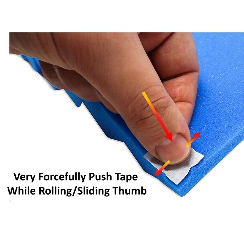 - Apply to foam firmly for 15 seconds, then remove white release paper.