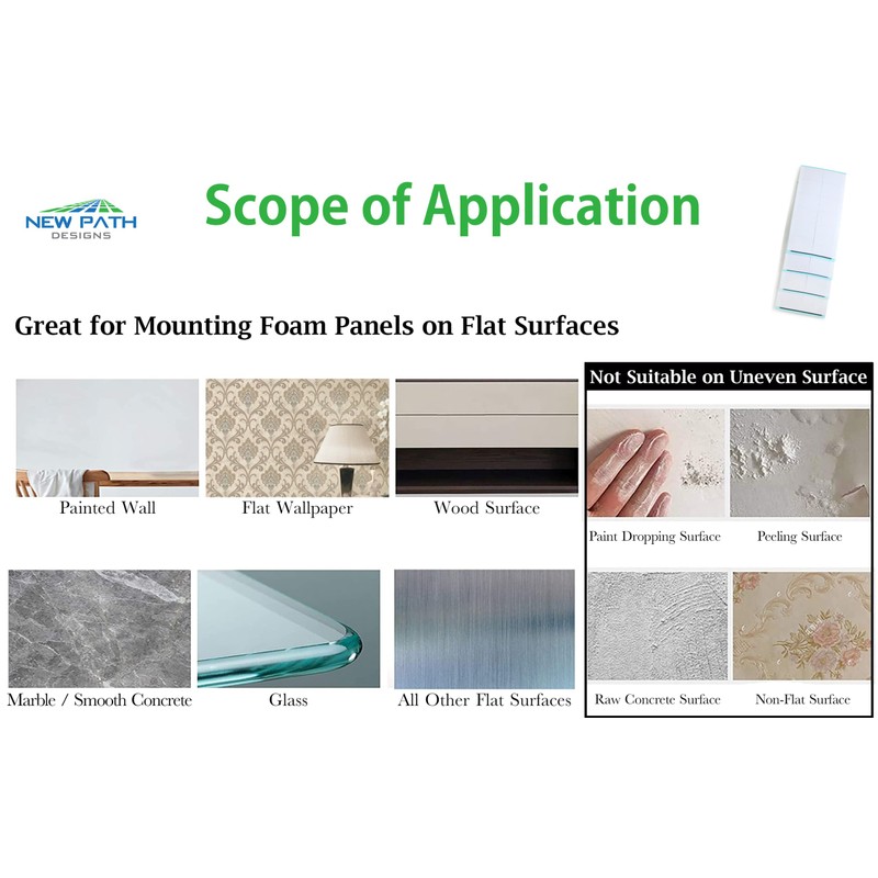 - Mount 48 foam panels (1-ft x 1-ft) up to 4-inches thick. We recommend 4 squares per 1-sqft of area for larger panels.