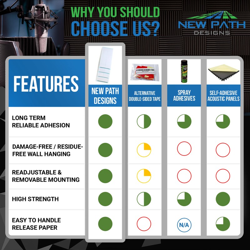- Unique tape for permanent foam bonding to acosutic panels and a strong removable/adjustable bond to walls.