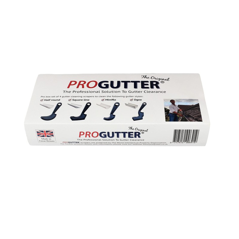 PROGUTTER The professional solution to gutter clearance. Cleaning your gutters has never been easier!!! The PROGUTTER system has been developed to help you clean gutters in a safer way. The interchangeable gutter scrapers allow you to clean gutters easily. What is included: 1x Half round gutter scraper, 1x Square line gutter scraper, 1x Ogee gutter scraper