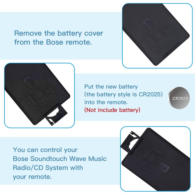 It is a perfect replacement for BOSE Soundtouch Wave Music Radio remote control. No programming or setup required, just install new battery (not included), it is ready to use. Requires CR2025 battery.